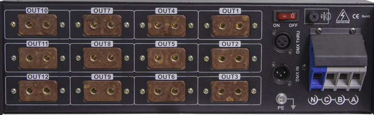 10.连接负载灯具作功率输出,每路输出座可接2个10A(2000W)负载灯具,带24个10A插头